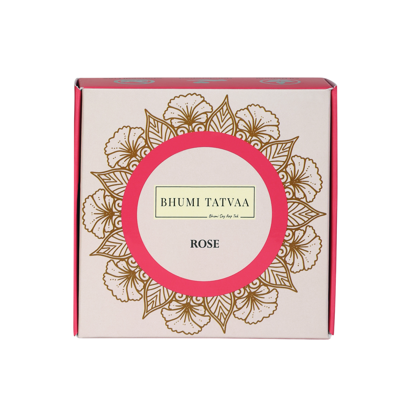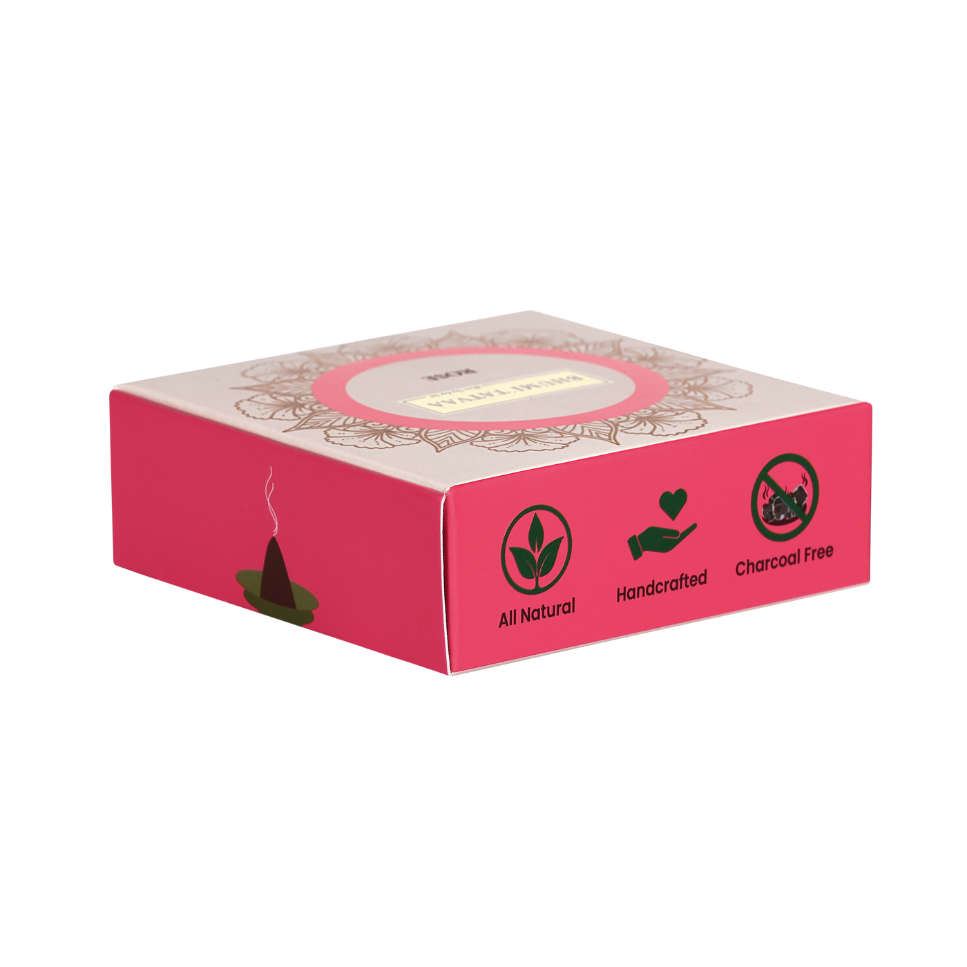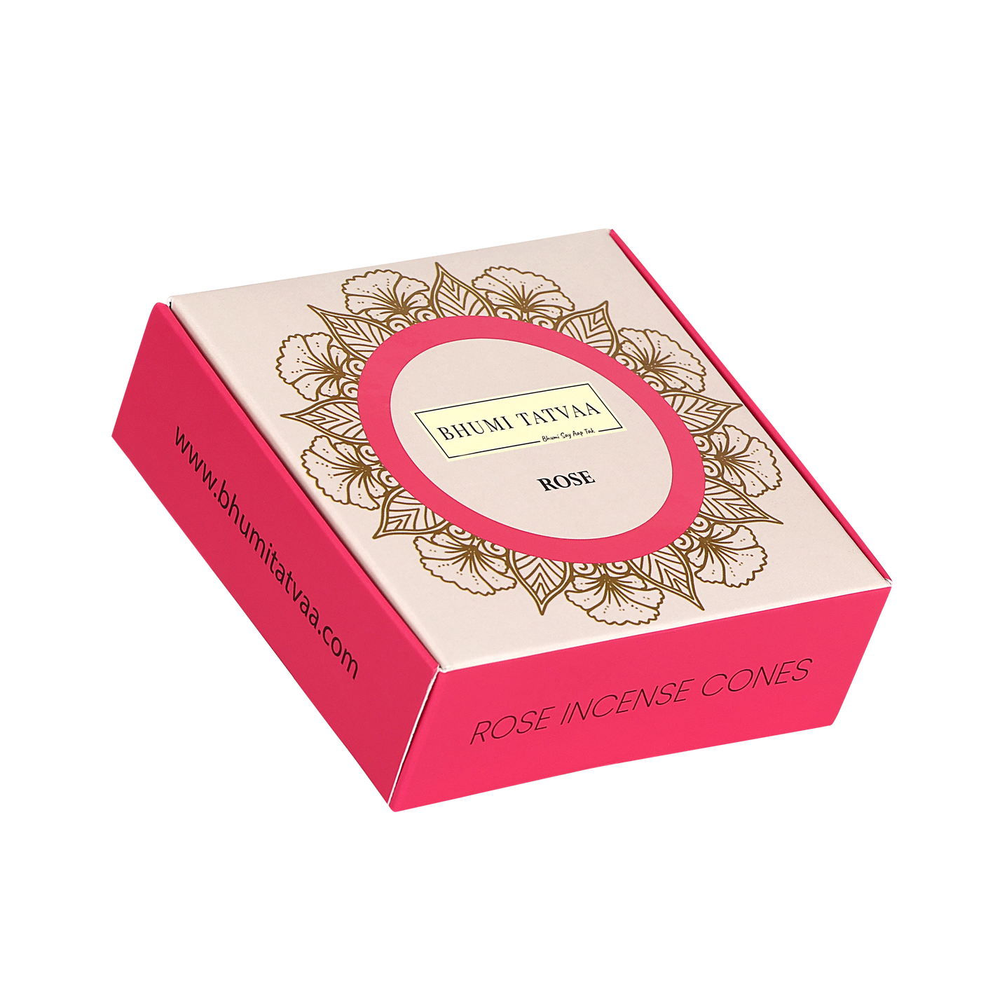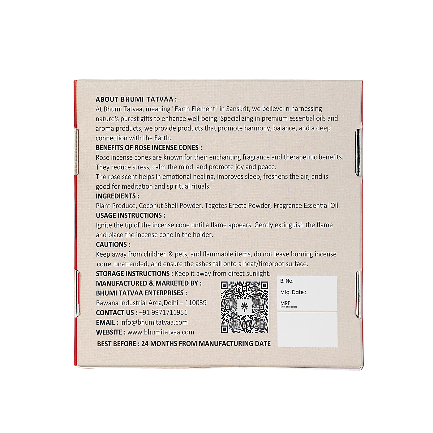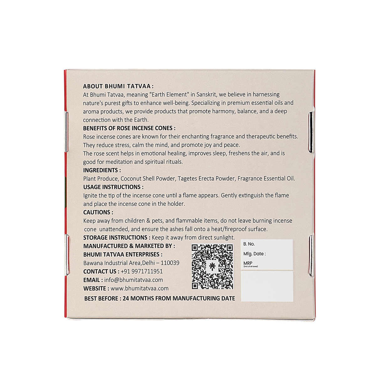 Bhumi Tatva Rose Incense Cones with a rich floral fragrance that reduces stress, uplifts mood, supports emotional healing, and creates a calming atmosphere. Pack of 40 cones.