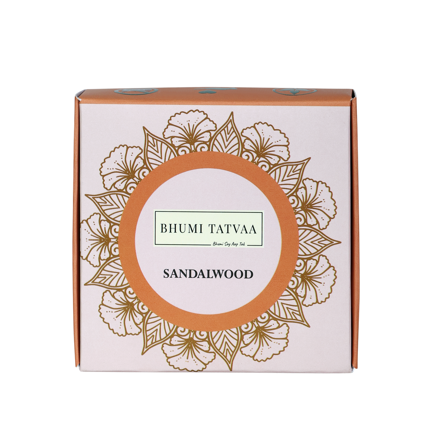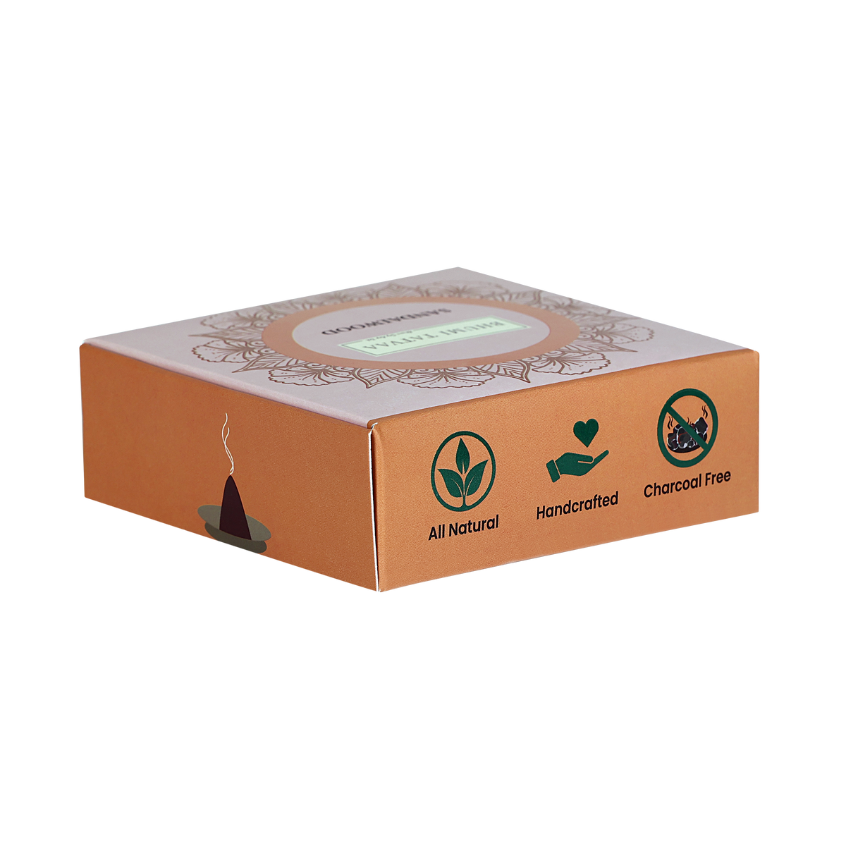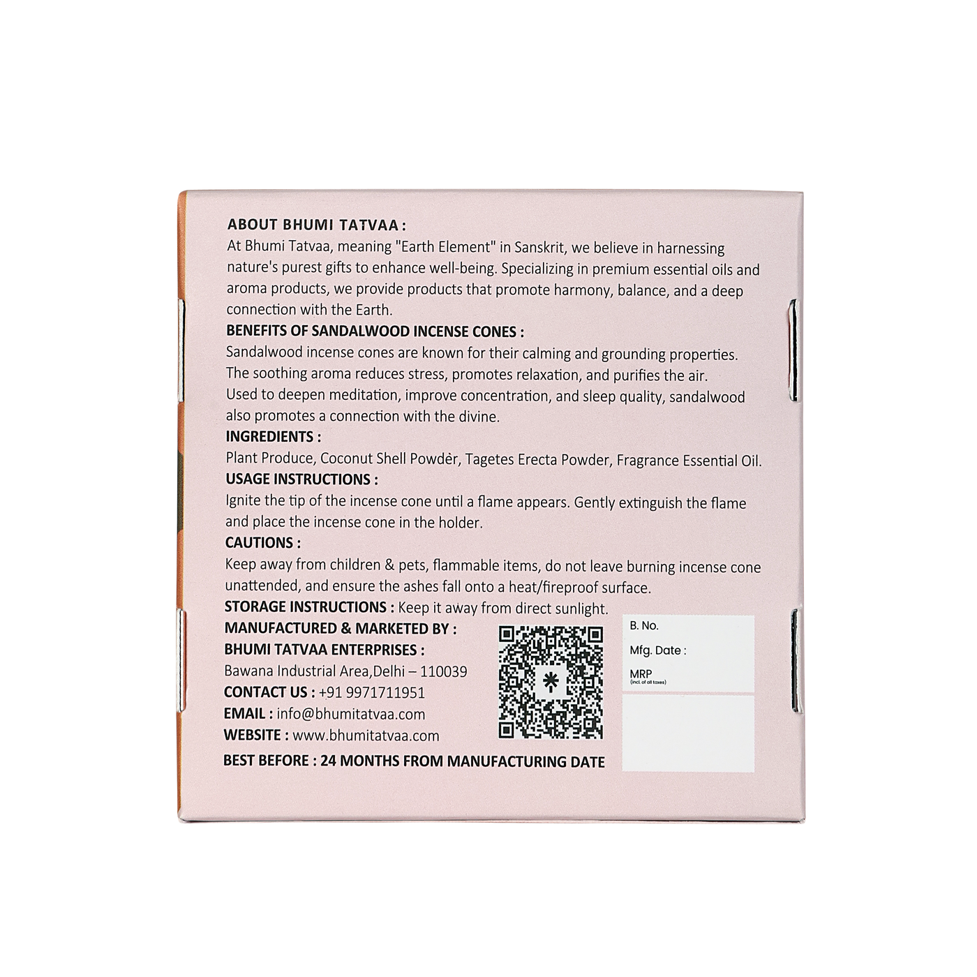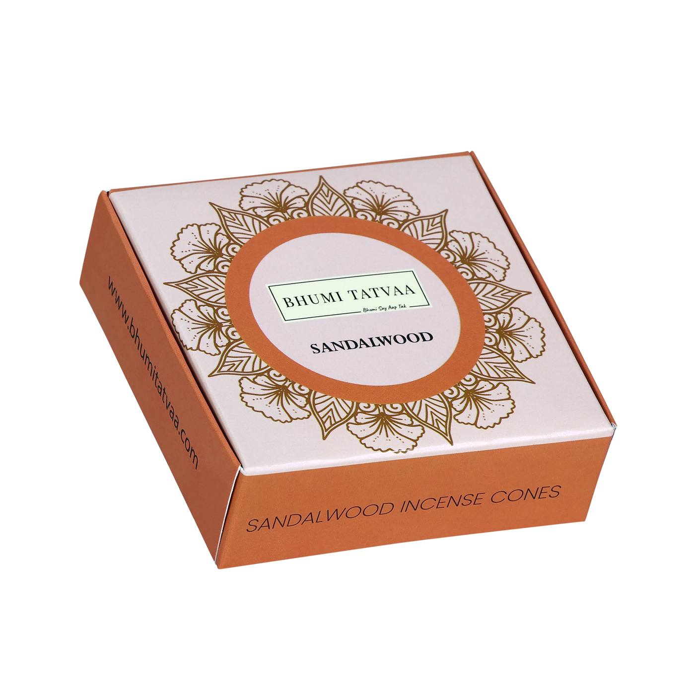 Bhumi Tatva Sandalwood Incense Cones with a warm, grounding aroma that reduces stress, supports meditation, improves sleep, and purifies the air. Pack of 40 cones.