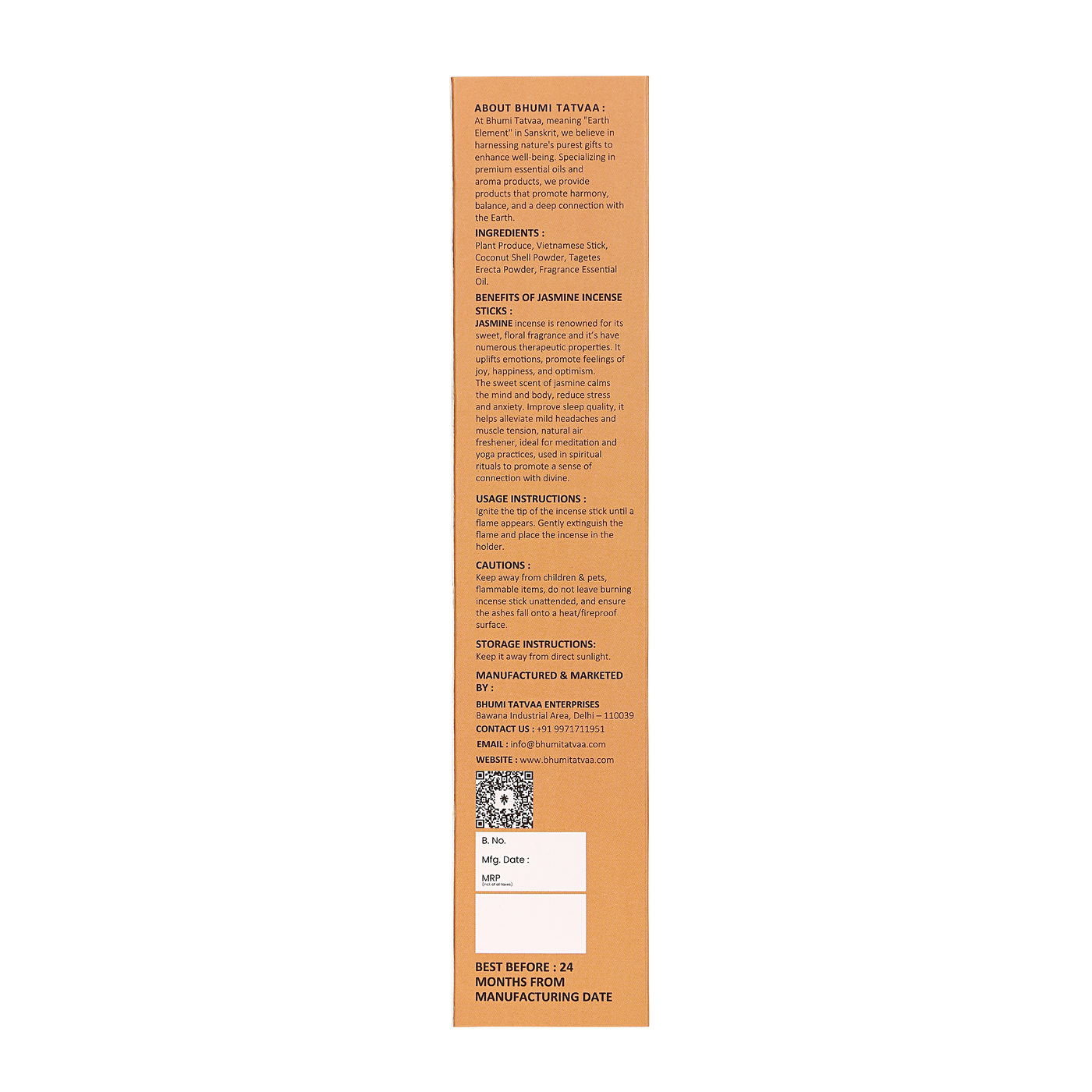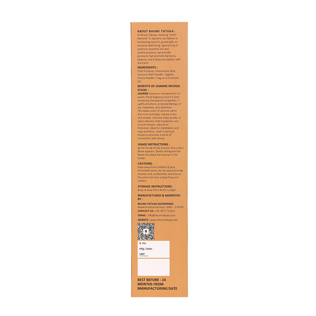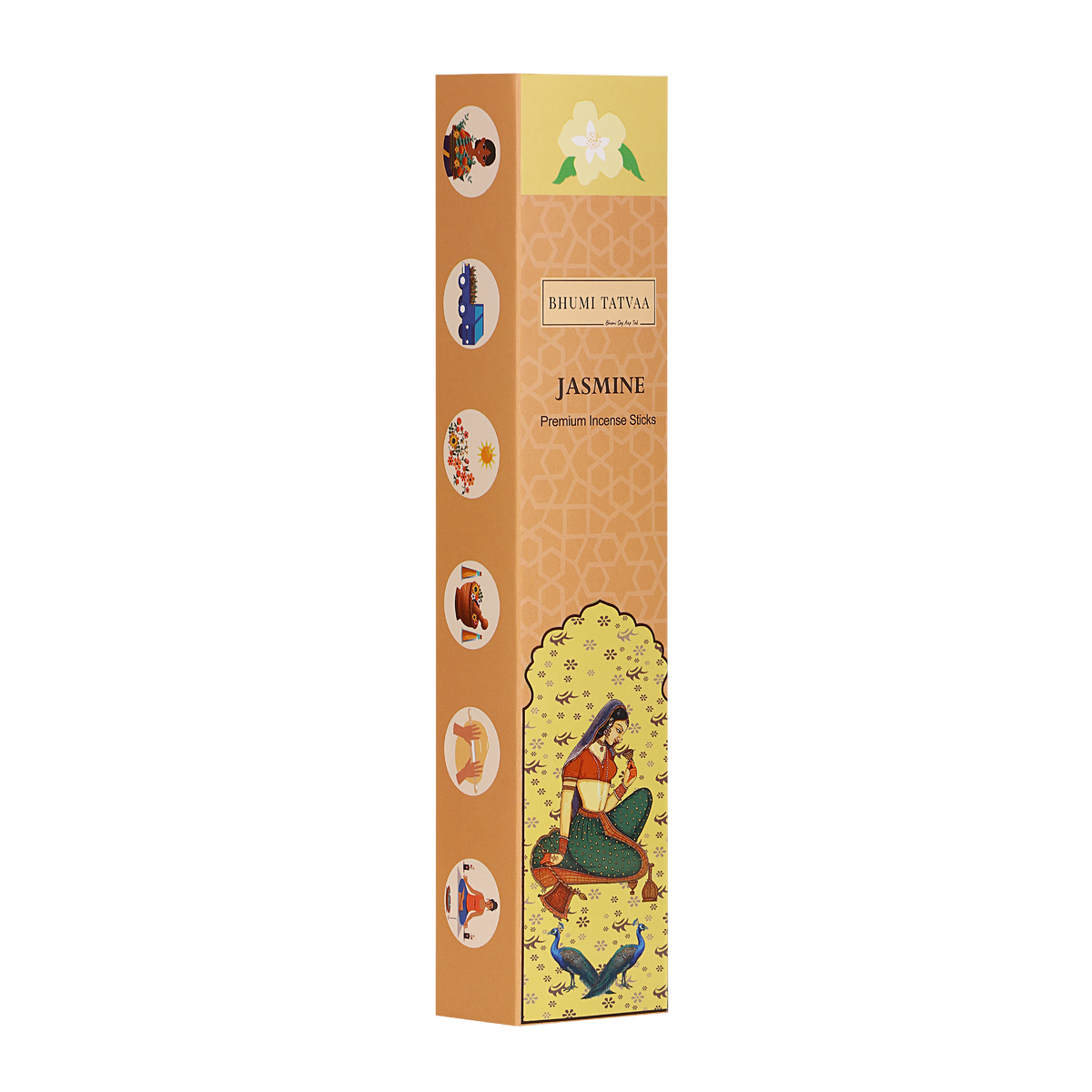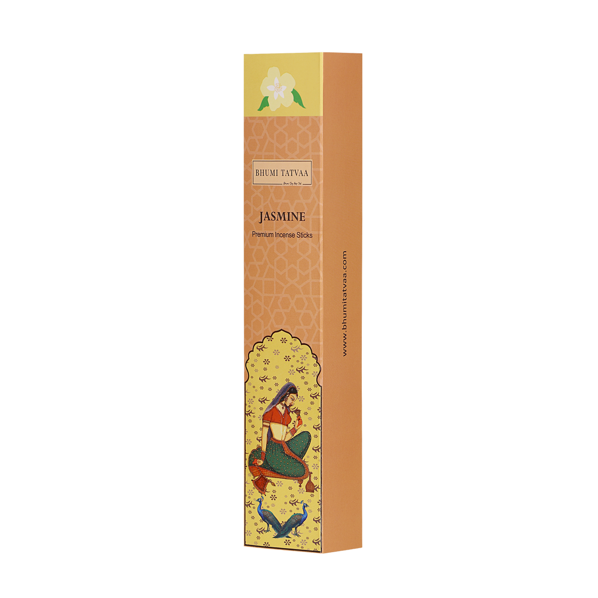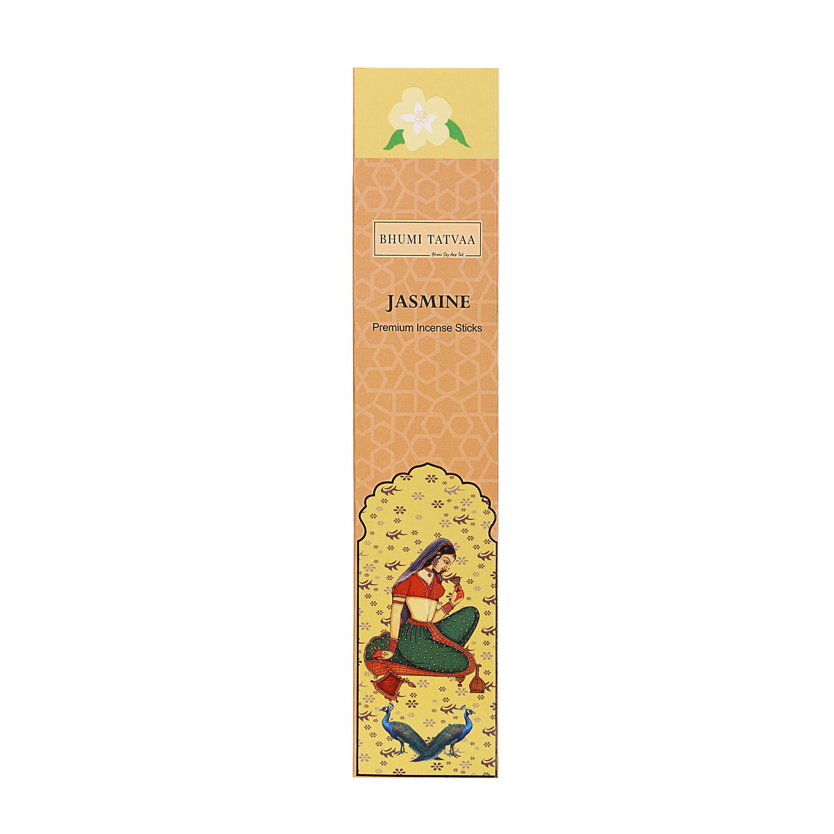 Bhumi Tatvaa Jasmine Incense Sticks with a sweet floral fragrance that uplifts mood, reduces stress, improves sleep, and creates a serene spiritual atmosphere. Pack of 40 sticks.