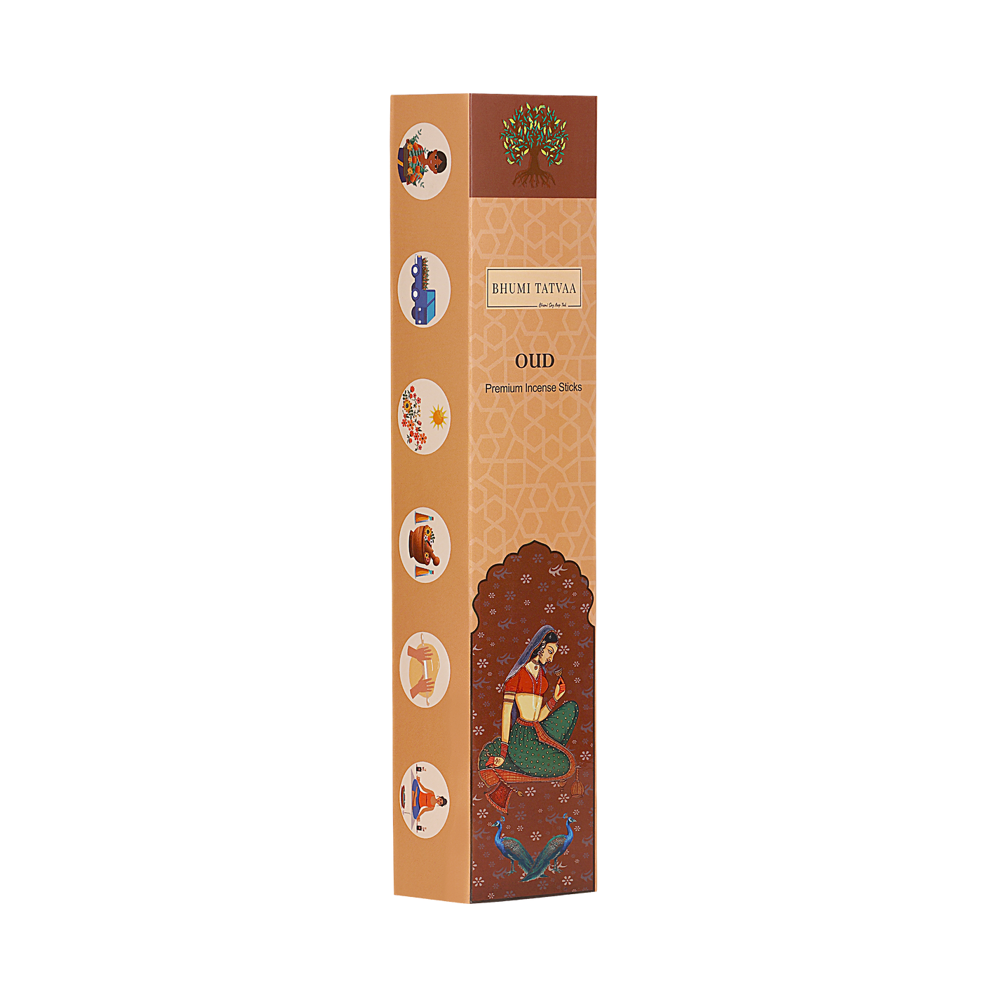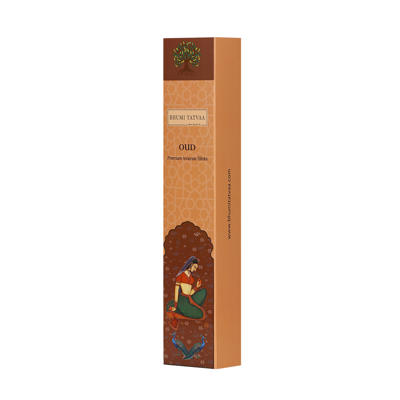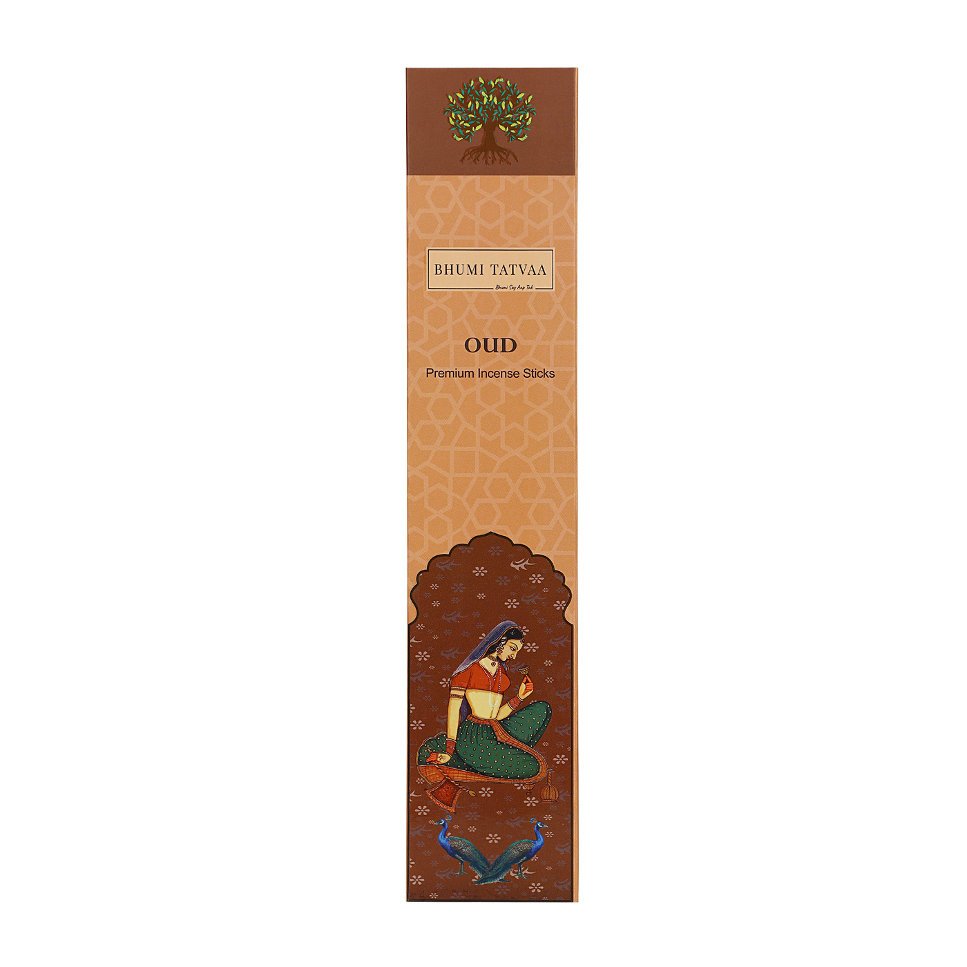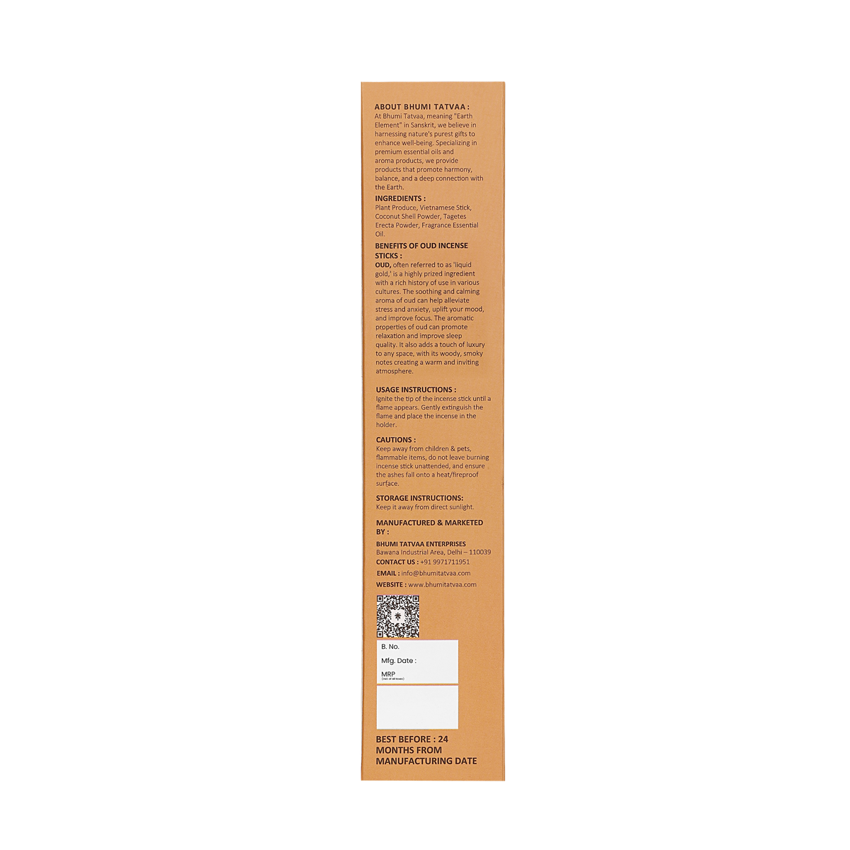 Bhumi Tatvaa Oud Incense Sticks with deep, woody notes that relieve stress, uplift mood, and enhance meditation. Luxurious aroma, 40 sticks per pack.