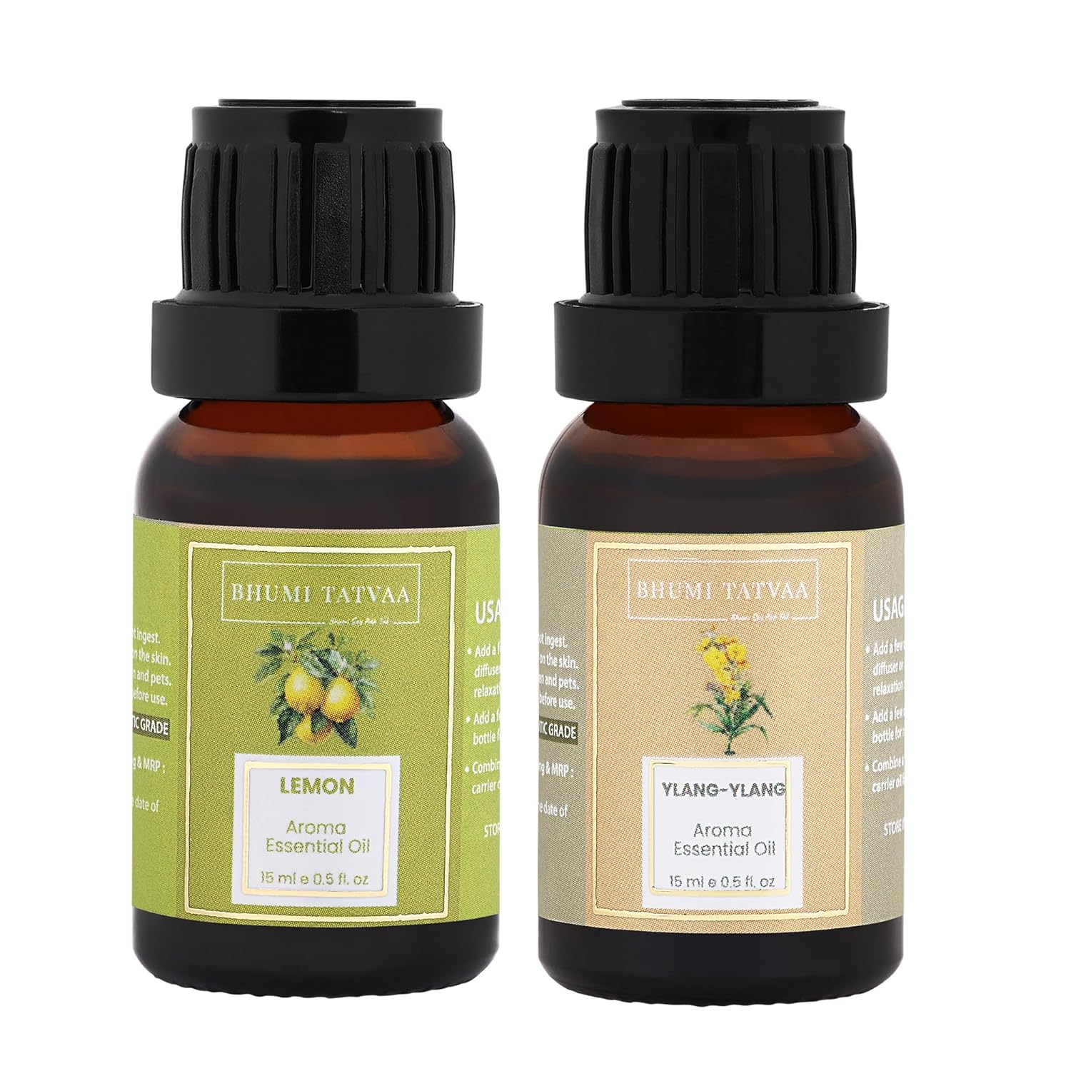 Bhumi Tatvaa Lemon and Ylang-Ylang Essential Oil | Pure Aromatic Oil for Relaxing Fragrance | Ideal for Diffusers, Massage & Everyday Use | Natural Lemon & Ylang-Ylang Scent - Pack of 2 - 15ml Each - Natural / 30.0 millilitre / Lemon and Ylang-Ylang